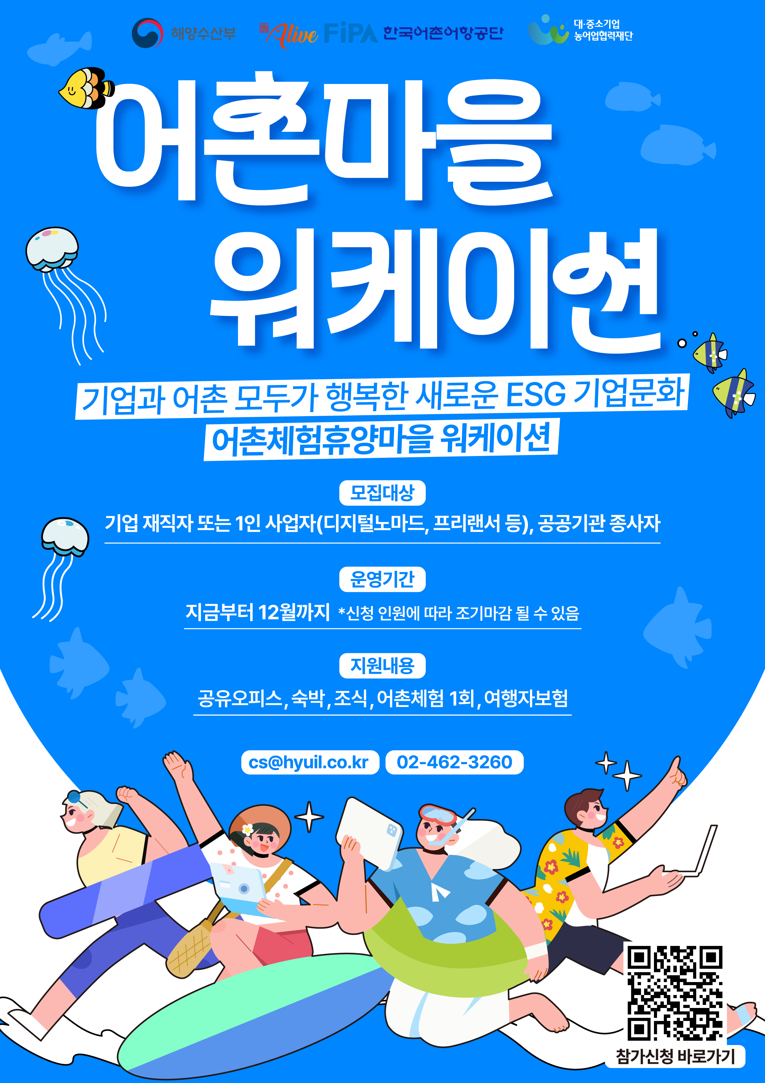 □ 모집대상 : 공무원, 기업 및 기관 임직원, 1인사업자(디지털 노마드, 프리랜서) 등 □ 운영기간 : 2026. 4. 6.(월) ~ 12월(예산 소진 시 조기마감) □ 지원내용 : 공유오피스, 숙박, 조식, 어촌체험 1회, 여행자 보험(1박2일~3박4일 선택 가능) □ 신청방법 : 포스터 내 QR코드, 아래 사이트로 이동(클릭)하여 신청